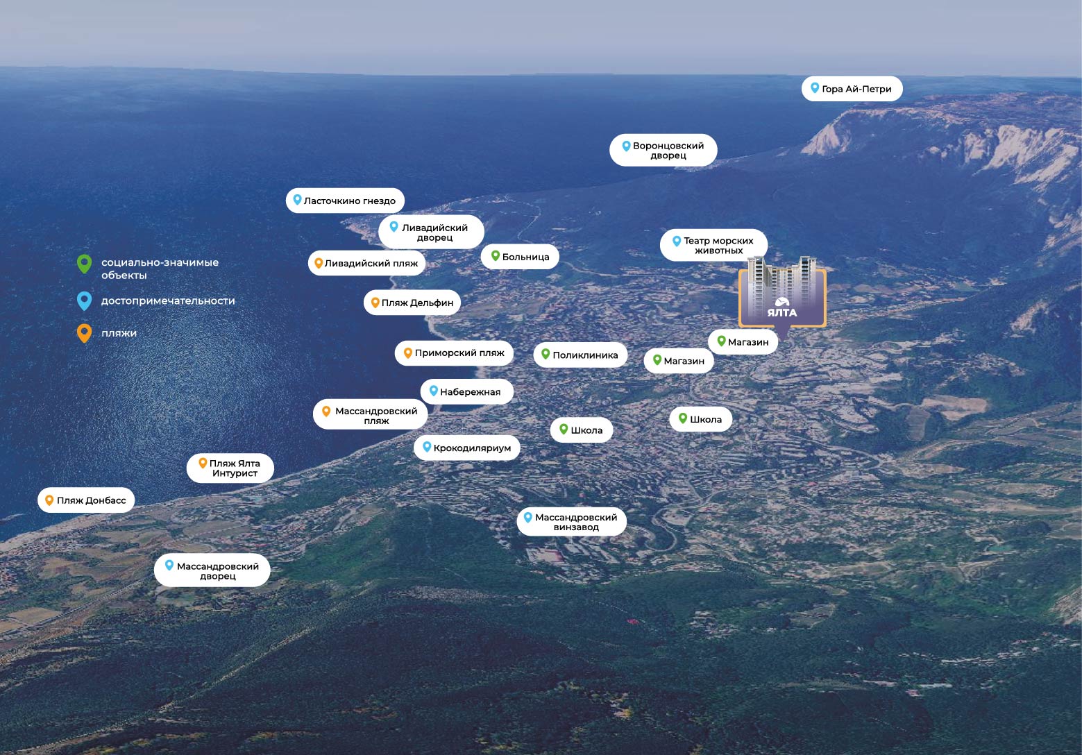 Клубный дом расположен в центре инфраструктуры города Ялта — в шаговой доступности находятся школы, детские сады, больницы и магазины. Комплекс окружает богатое историческое наследие Ялты: винные заводы, дворцы и пляжи окружают город и комплекс.
